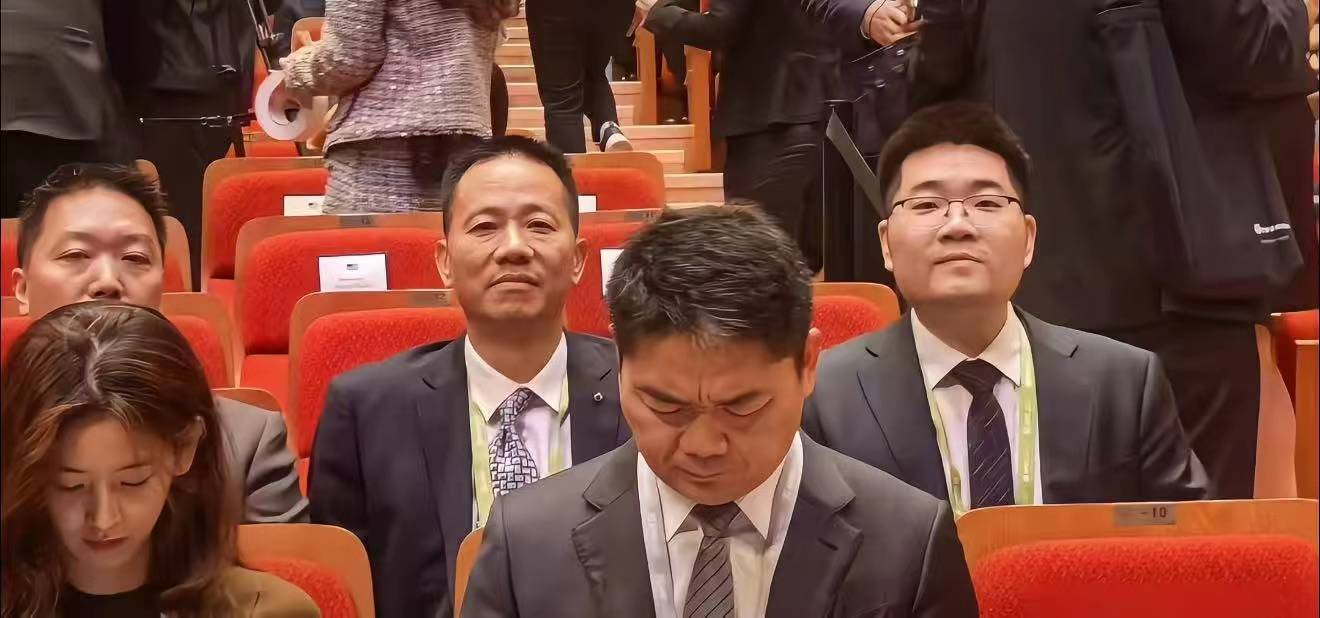 刘强东成熟稳重,甚至额前还留着那缕白发。刘强东西装革履,很有商业大佬的范。他认真的听着会议内容,时而若有所思。