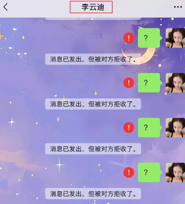 司晓迪还晒出了截图,证明自己被李云迪拉黑了,自己连续发了多个问号,对方都没有加回来。