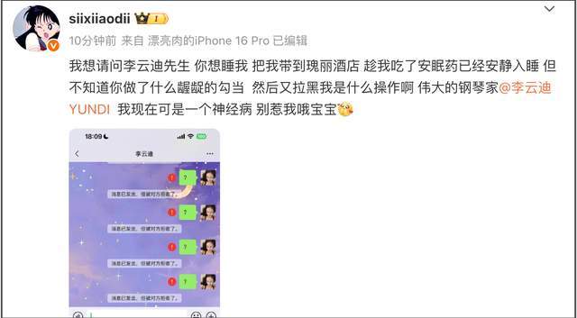 从女方爆料的信息看,李云迪似乎对她并没有上心,只是疯狂想约她,约不到就拉黑了。女方发现后就恼羞成怒开始发文喊话。其实男的目的不纯的话,没必要因为拉黑而生气,远离这种人才是最好的, 也是不懂司晓迪为啥那么暴怒。