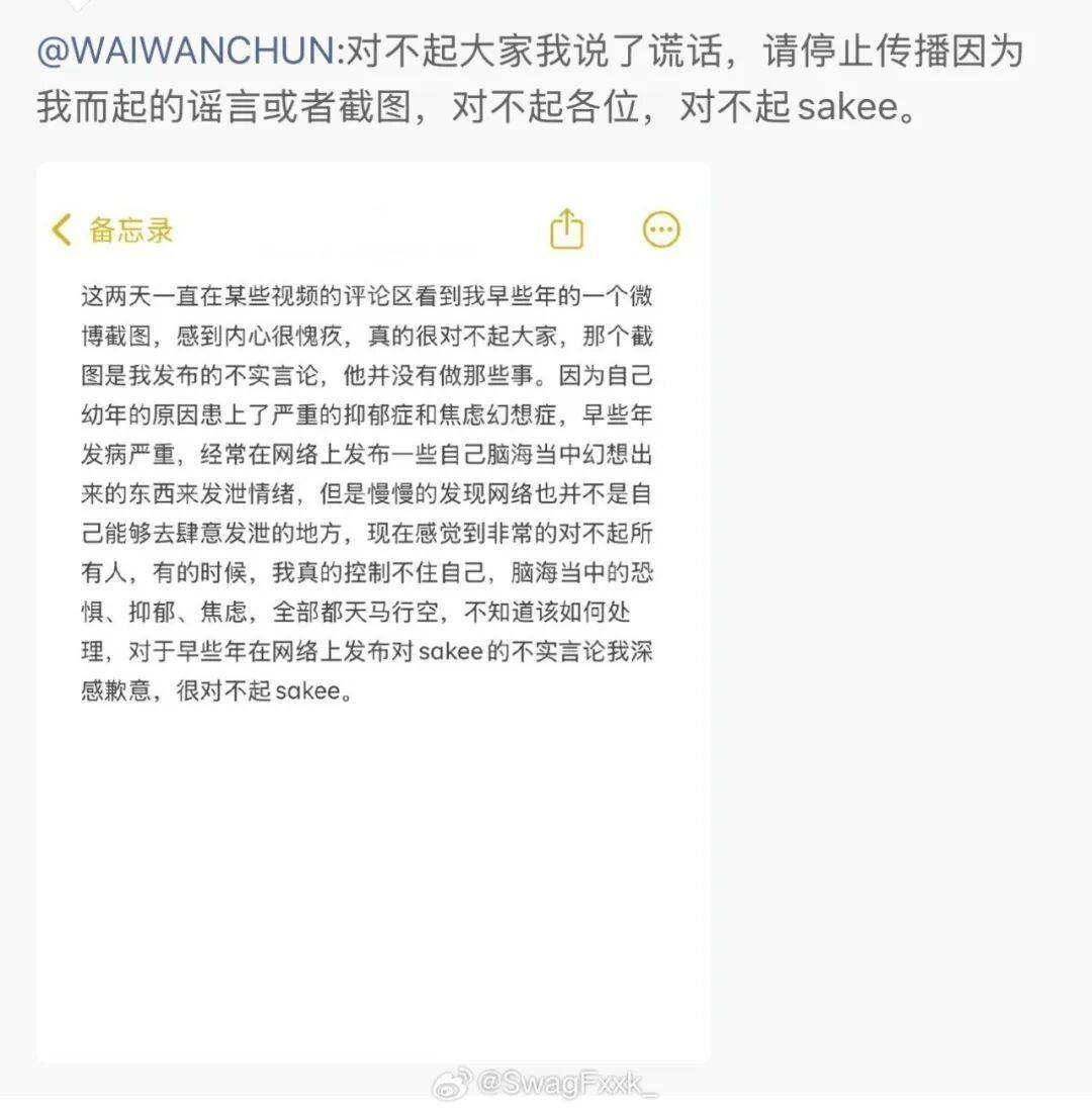 “真的很对不起大家,那个截图是我发布的不实言论,他并没有做那些事。对于早些年在网络上发布对sakee的不实言论我深感歉意,很对不起sakee。”