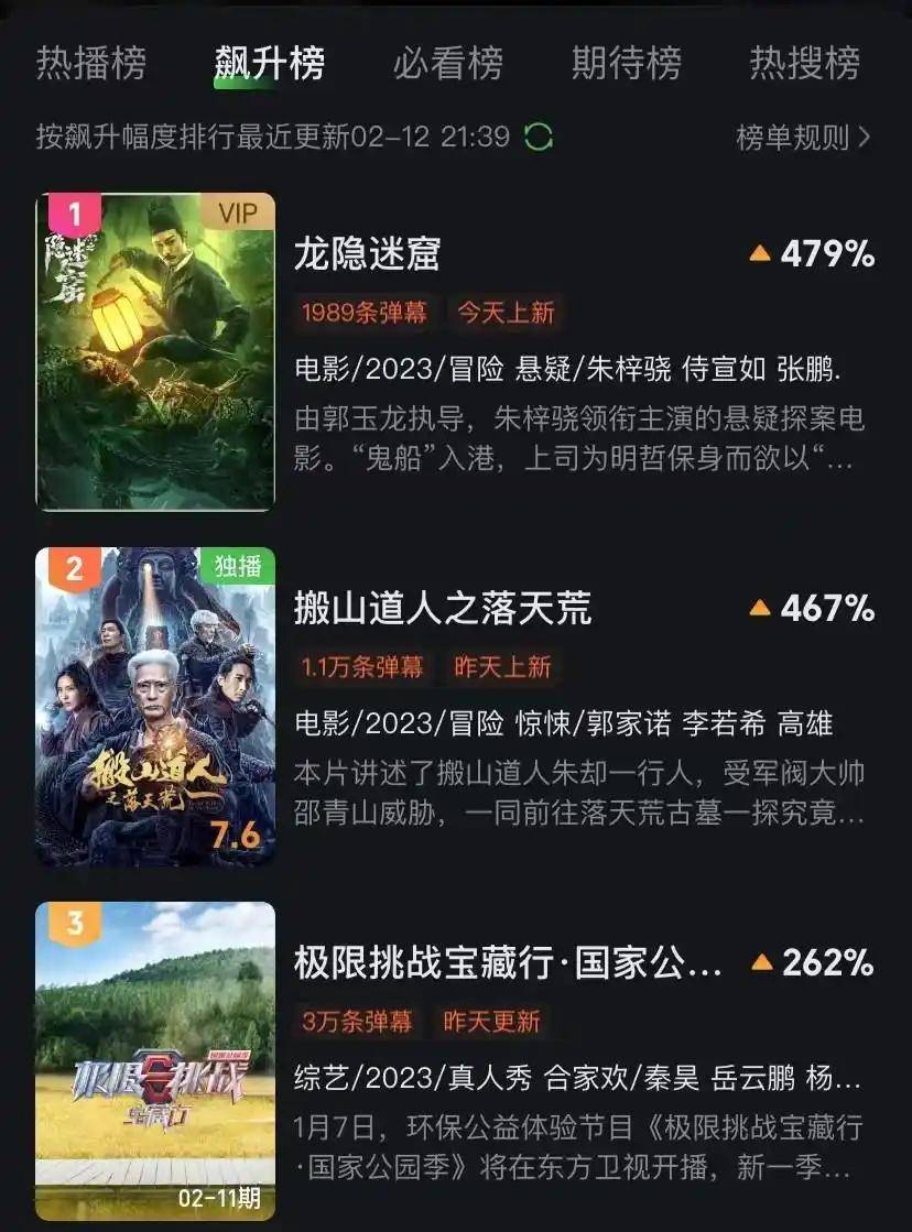 不过,悬疑剧没等来,反倒是悬疑电影先等来了,《龙隐迷窟》上线后,直接夺下平台飙升榜第一的位置,热度是实打实的。