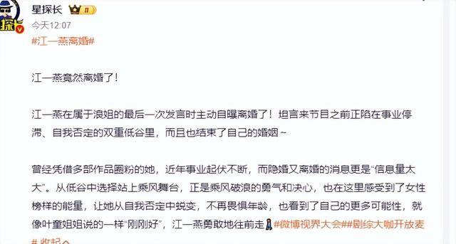由此可见,离婚这件事儿,对江一燕的打击还是很严重的。
