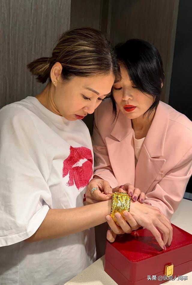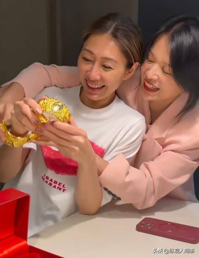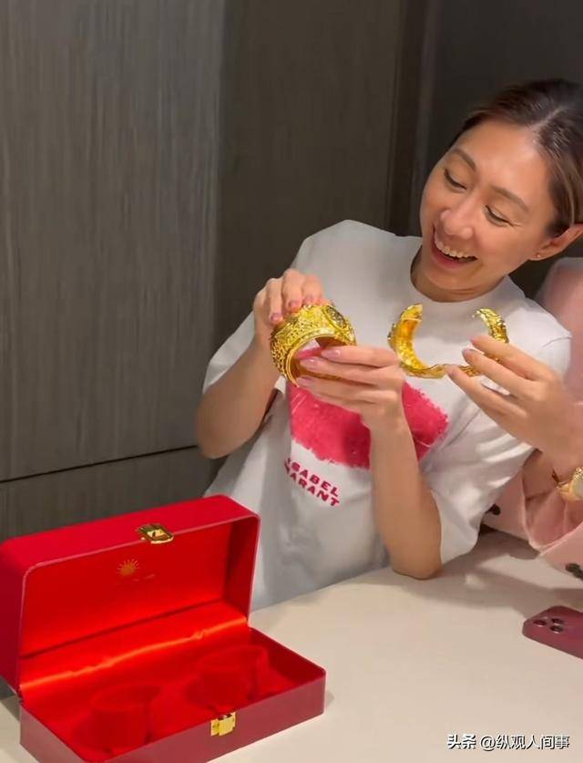 照片里她素颜穿着家居服,手腕上明晃晃戴着一对纯金龙凤镯,配文"好姐妹果然讲得出做得到"。