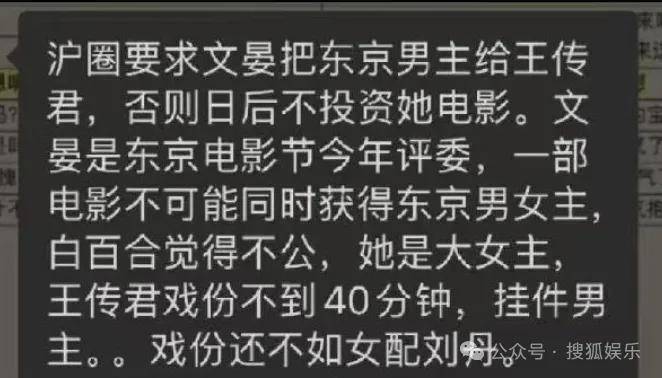 有传言称:“是沪圈要求评委文晏把东京男主给王传君,否则日后不投资她电影。”