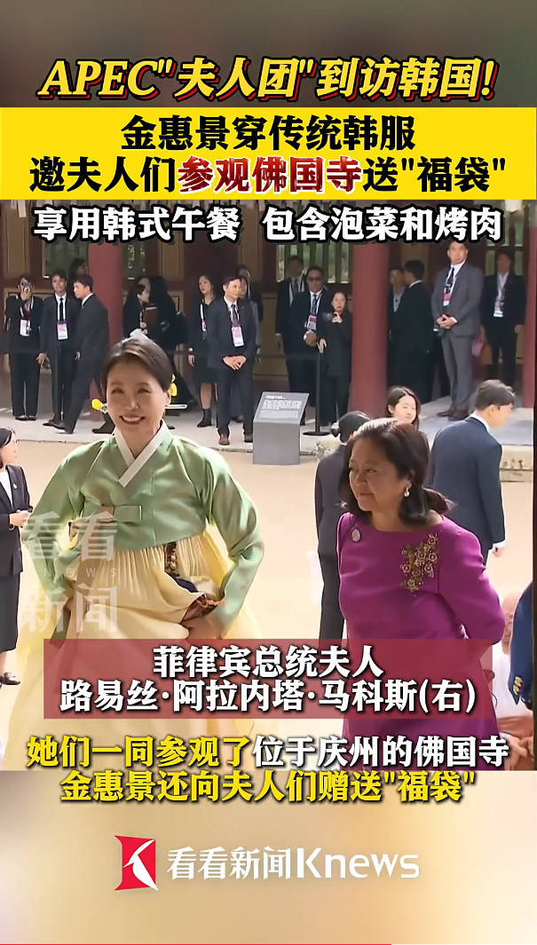 当天,她们一同参观了位于韩国庆州的佛国寺。该寺已被列入联合国教科文组织世界遗产名录。金惠景还向夫人们赠送“福袋”。