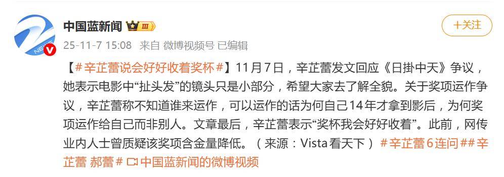 一座尼斯影后奖杯,竟炸出了满城风雨。11月7日,辛芷蕾用一串火药味十足的“六连问”正面硬刚质疑,把“《日掛中天》获奖威尼斯影后是否有黑幕”的争议推上了舆论浪尖。