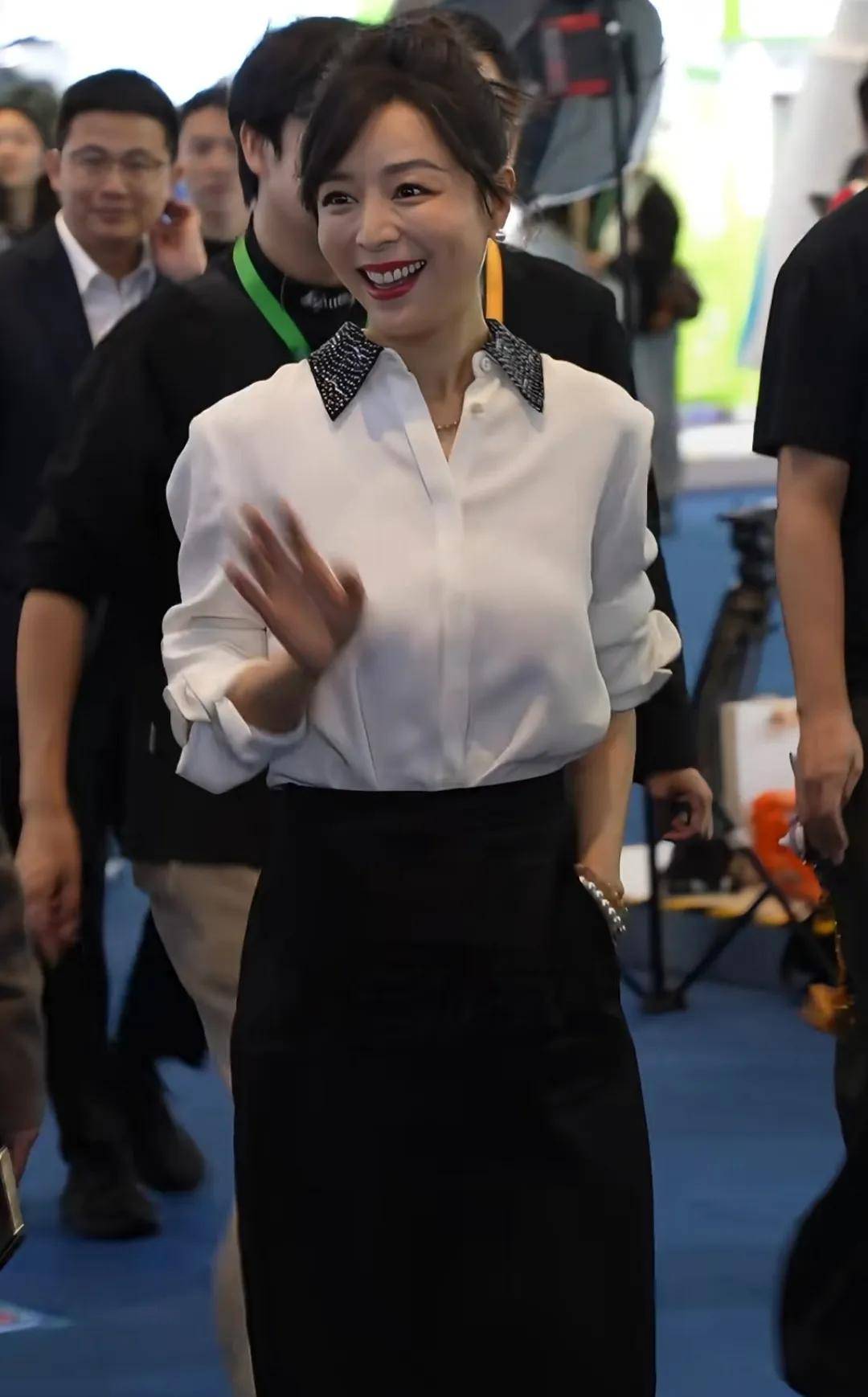 从网上曝光的活动现场照片可以看到,张静初身穿白色衬衫搭配黑色长裙,风格干练。她笑容满面地和在现场的人打招呼,整个人气质优雅,落落大方。只是,当镜头拉近,张静初脸上的妆容看上去妆感很重,又黑又粗的眉毛搭配突兀的大红唇,显得不太精致。