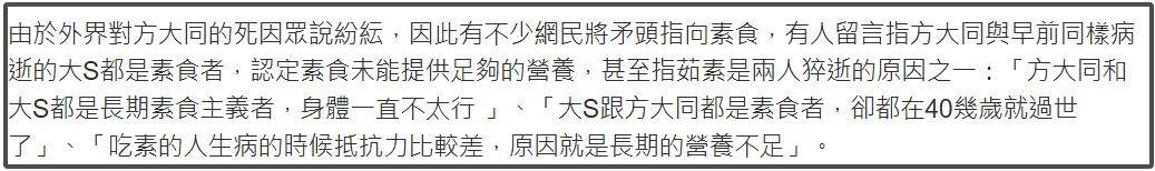 今年三月,方大同去世的消息传出之后,他生前的饮食习惯也被扒了出来,很多网友觉得长期吃素造成了方大同抵抗力差,这也成为了他的病因之一。彼时,张静初的评论区直接沦陷,一方面大家觉得方大同就是前车之鉴,另一方面大家认为公众人物公开宣传吃素带来的影响也并不正面。
