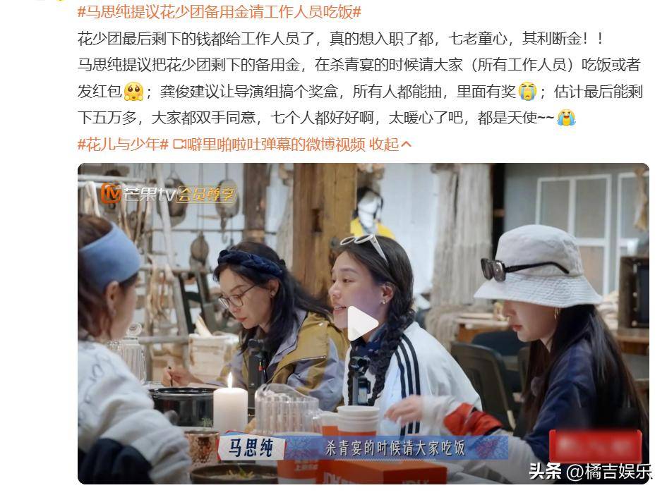 在《花儿与少年》这一综艺节目的过程中,马思纯展现了她独特的暖心举动和创新思维,给观众留下了深刻的印象。节目进行时,她提出了一个十分新颖且贴心的提议,那就是用节目备用金请工作人员吃饭,这一想法迅速引起了团队内外的关注。