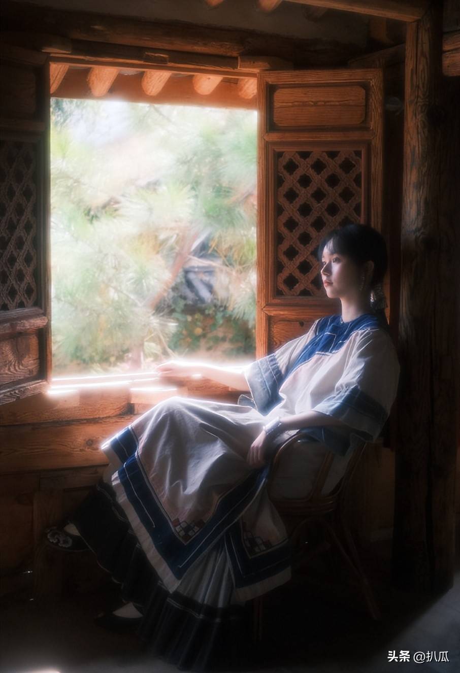 有一张是坐在木窗前的照片,她斜靠在椅子上翘着二郎腿,手掌搭在窗沿,照片则是做模糊模糊处理,这一幕有了古欧洲女性的既视感。