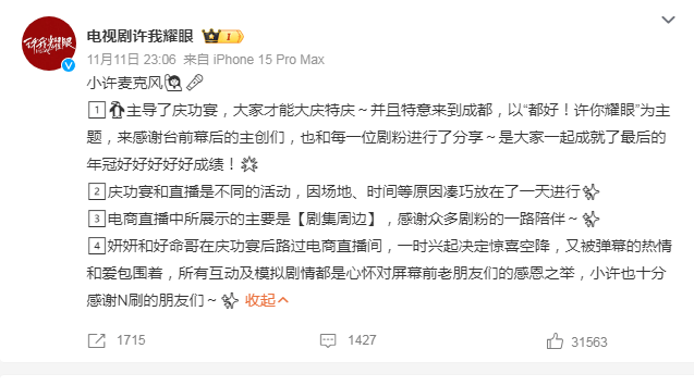 庆功宴(感谢主创与剧粉)与电商直播(售卖周边)是两场独立活动,因场地与时间安排巧合在同日举行;所售均为《许我耀眼》官方周边,未涉无关商品。
