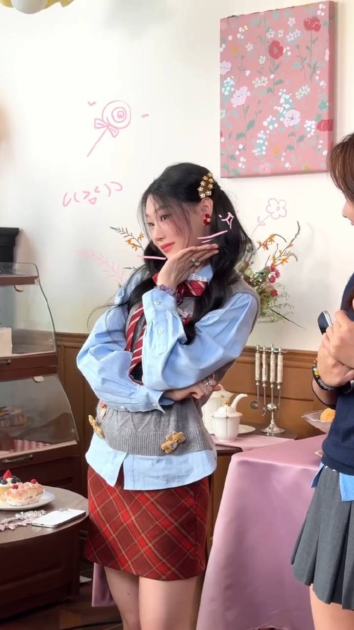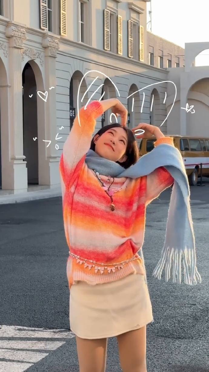 沈佳润穿彩色毛衣配蓝围巾好清纯。