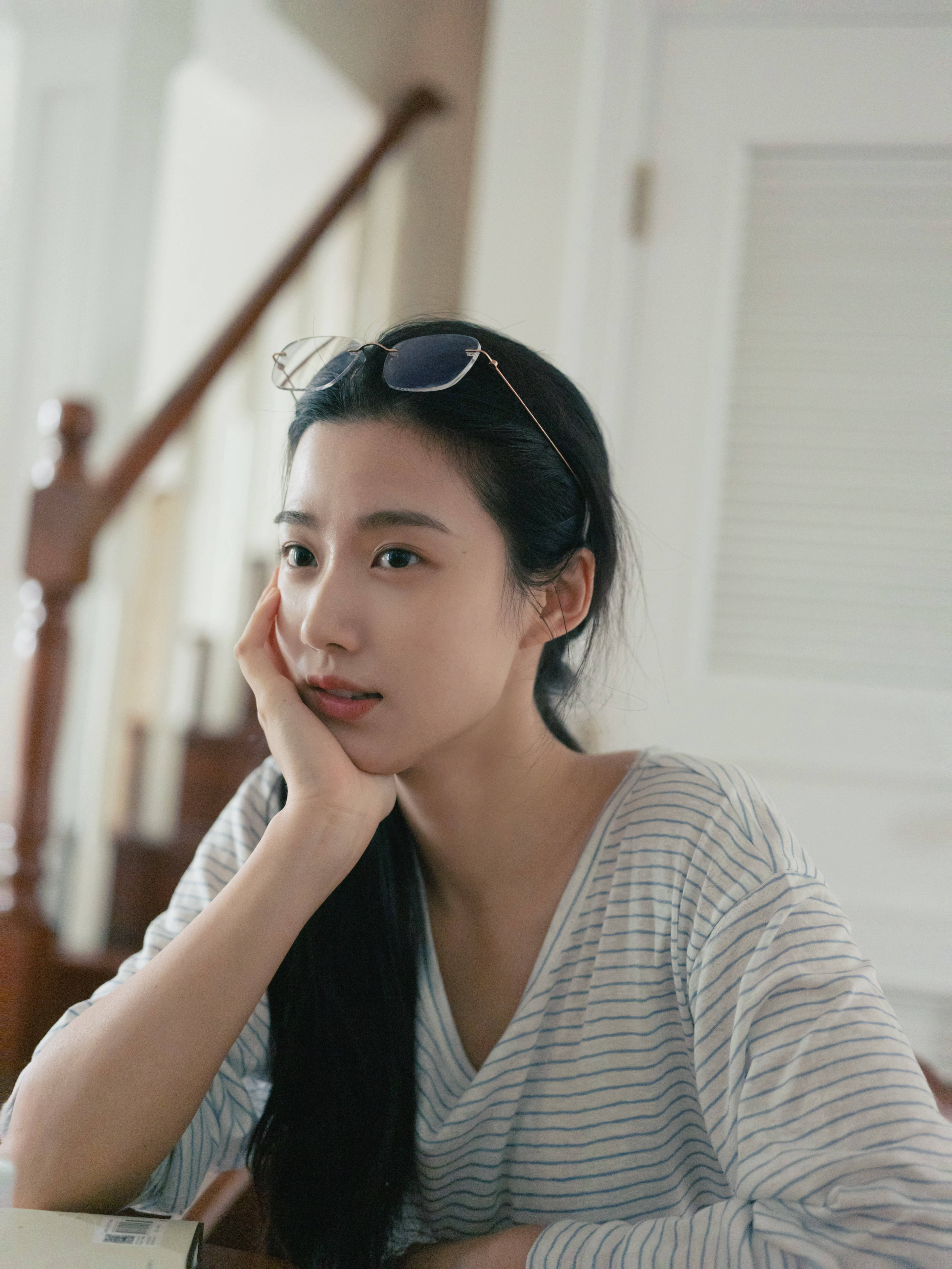 卢昱晓单手托腮,妆容清淡,五官秀美。