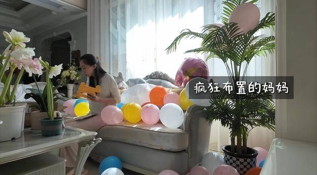 水亦诗找来气球将家中简单布置一下,全程都是她一个人在打气球装饰,公婆稳稳坐在沙发上照顾孩子,保姆则是在厨房忙家务。