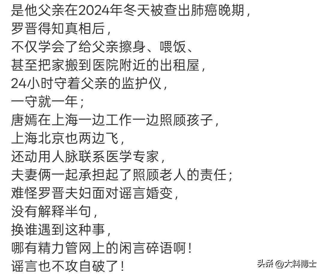 知情网友透露,罗父去年冬天确诊肺癌晚期后,罗晋为了照顾父亲,从上海搬到了北京,父亲最后的时光里,他一直守在病床前侍候,一守就是一年。