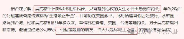 2011年,吴克群被指和赌王何鸿燊的女儿何超莲在一起了,有媒体拍到他开着“大黄蜂”带女方看阳明山夜景。