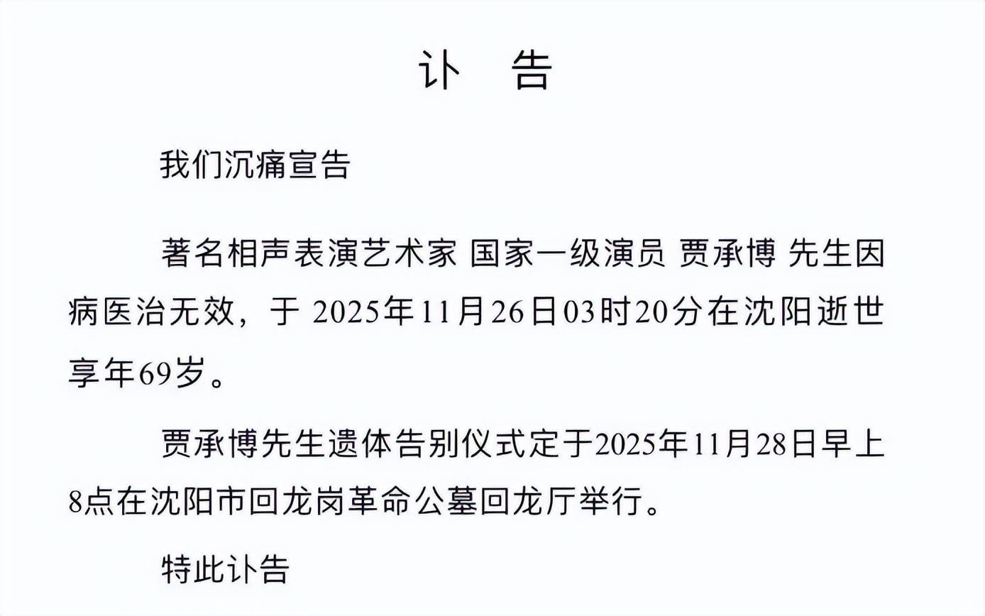 当下,贾承博治丧小组已对外发布讣告,其中提到贾承博于2025年11月26日03时20分在沈阳逝世。