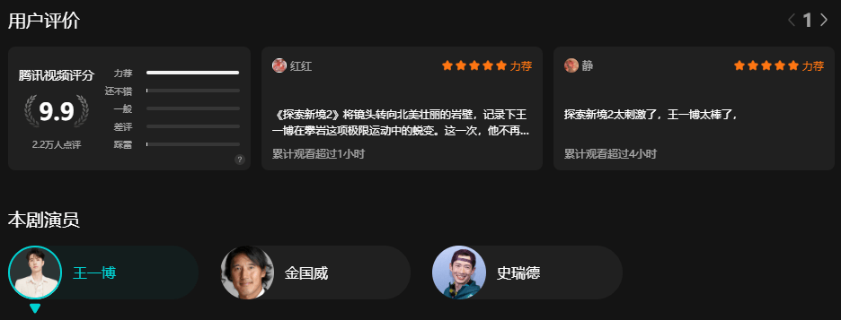 11月28日,《探索新境》第二季的首期节目在腾讯视频上线。在这一期当中,王一博和他的朋友们来到美国的攀岩地,不仅挑战了山体岩缝当中的攀岩内容,更是一起高空当中钢丝之上行走,可谓是惊心动魄。而首期节目播出之后,形成了清一色的好评局面。在腾讯视频,这期节目的真实观众评分高达9.9分。在豆瓣,都是四星和五星的好评状态。