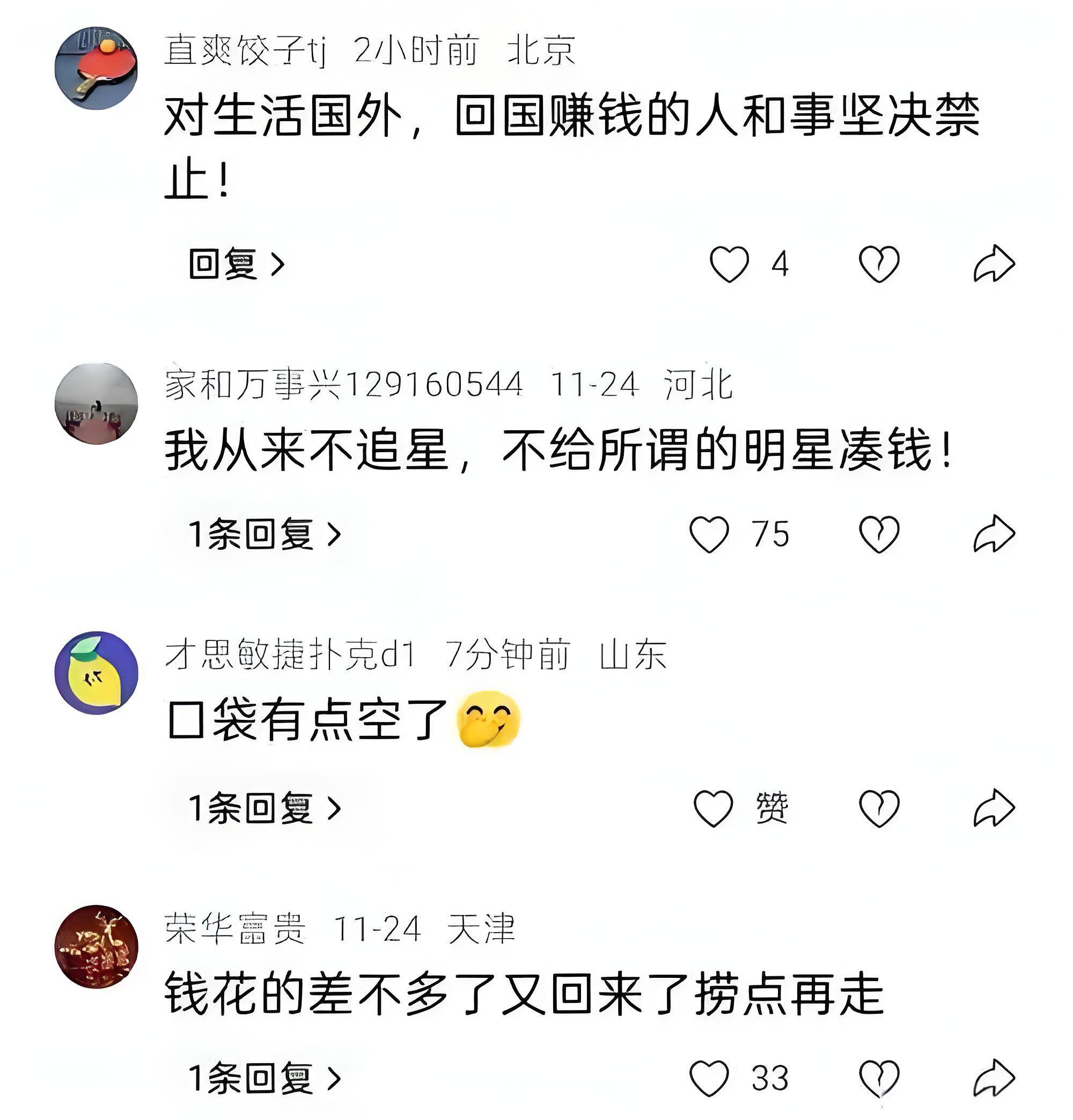 更有高质量的网友问道:“你在国外纳税,国内演出的收入会流向哪里?”这一句话瞬间引起了网友的反感,