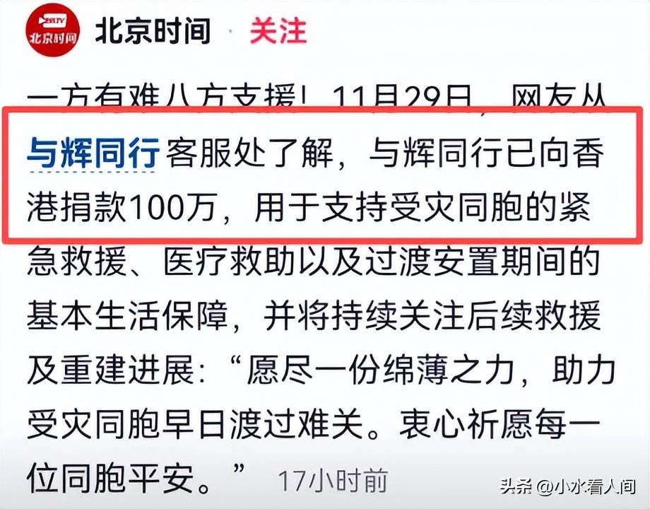 11月29日,香港火灾后,各行各业都纷纷献出爱心,帮助香港受难同胞共渡难关,而董宇辉竟然悄悄捐了100万,没有任何宣传。