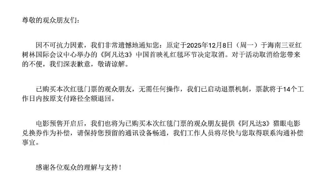 取消得有多彻底? 红毯没了,现场装置全拆,灯光秀停,主办方连夜退票,还给每位观众赔偿电影券。