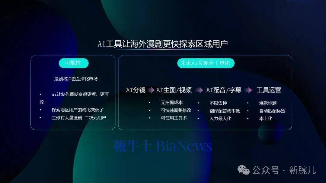 刚才说了一些单点,也可以串联起来看。AI制作让周期更短、更可控,同时又能用AI探索海外地区,再加上现在AI即将实现全工具化应用,现在它已经100%参与制作环节中,不一定是完整由AI制作,但它已经以辅助形式参与了每个环节,包括AI生图、AI配音、工具、运营等等,我们自己的应用程度很高。