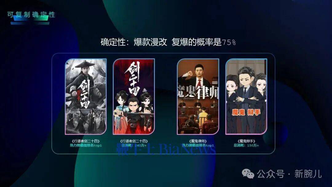 和大家分享一个数据,这是一个内部的数据。我们魔方的爆款在漫改复爆的概率是75%,这是很难得的确定性,因为在市场上想做到20%的爆款率都是很难的事情,现在IP给可复制性确定性带来了成绩,这是真正的潜力所在。