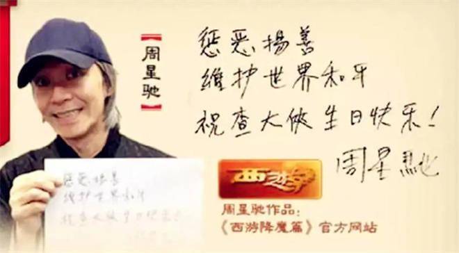 2014年,适逢金庸先生90大寿,周星驰手写了一幅字,送上自己对金庸的祝福:“惩恶扬善,维护世界和平,祝查大侠生日快乐。”足见巨星情谊。