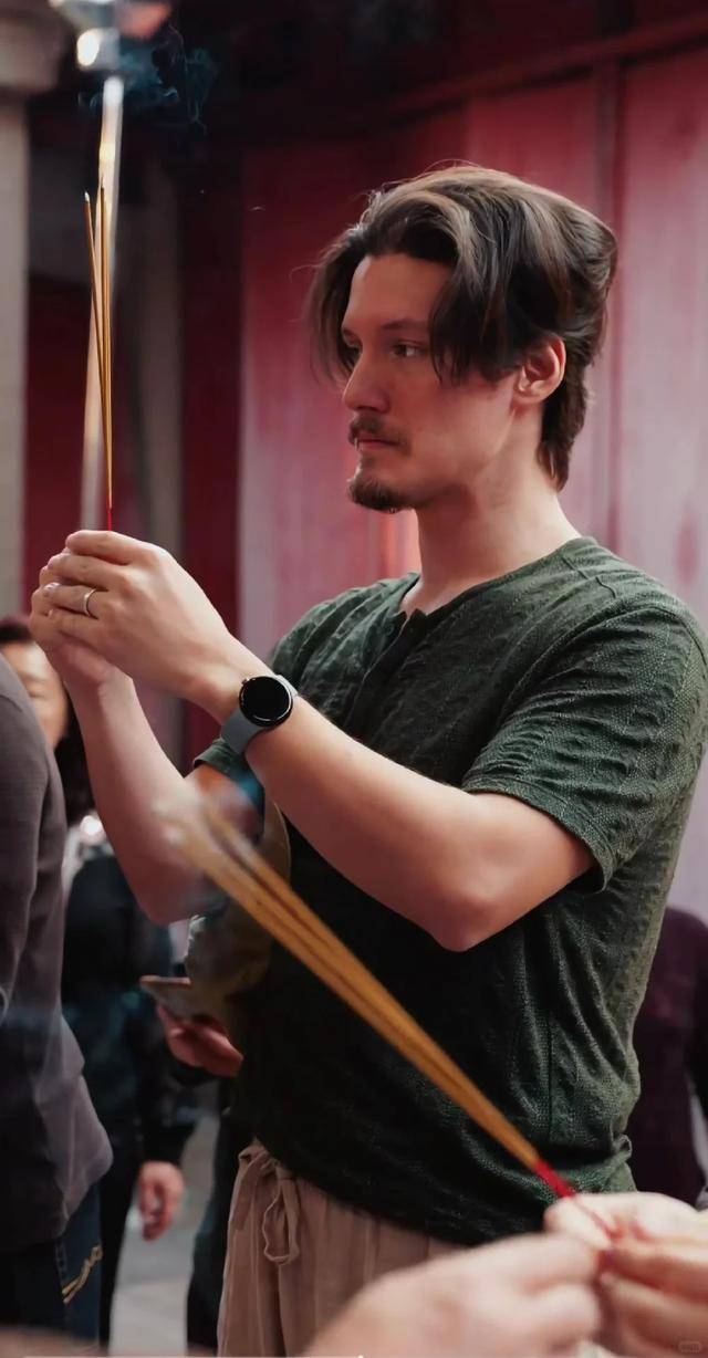 不得不说,这个场面还真是有些喜感,一脸外国长相的儿子,手里拿着三根香祭拜祖先,如果不是周华健,恐怕还真让人以为这是“AI”制作的。