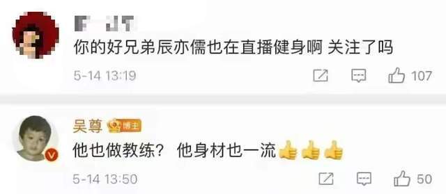 但很快故事就发生了反转,2022年,吴尊在社交平台上为刘耕宏打call,有网友提到了辰亦儒也在直播健身,吴尊颇为意外的回答“他也做教练?”,和动态中的热情宣传形成了鲜明的对比。