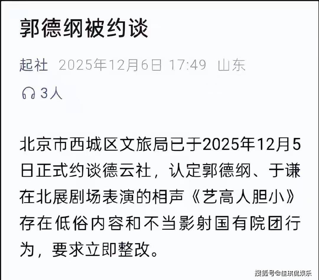 有名为“起社”消息称:西城文旅局正式约谈了郭德纲及德云社相关负责人,直接明确指出《艺高人胆小》“存在低俗、不雅内容”,违反了公共演出的内容规范,要求立即停止传播并全面整改。