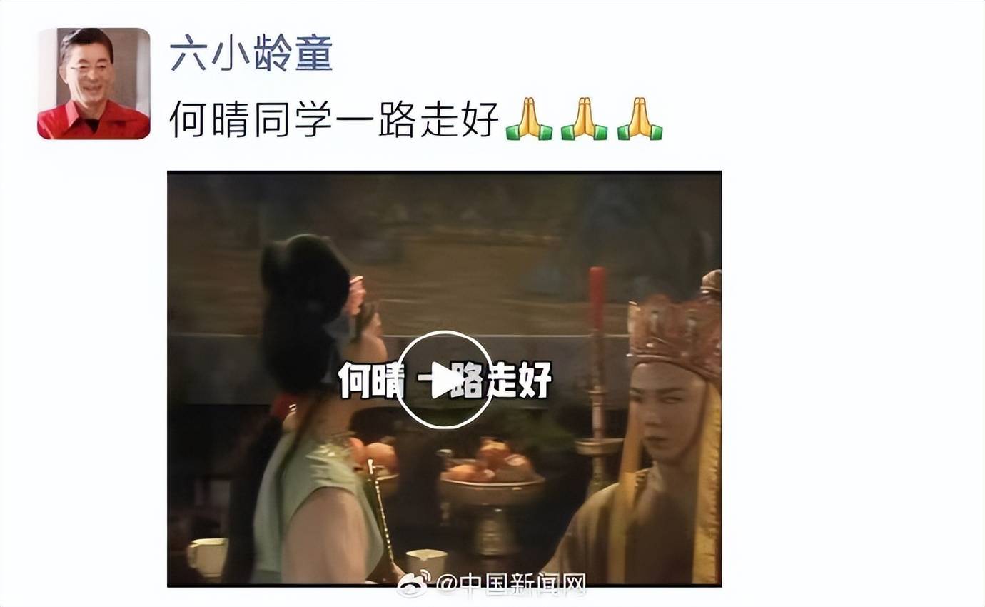 得知噩耗,六小龄童在朋友圈发文悼念老同学何晴,他们都是浙江昆剧团的同学。