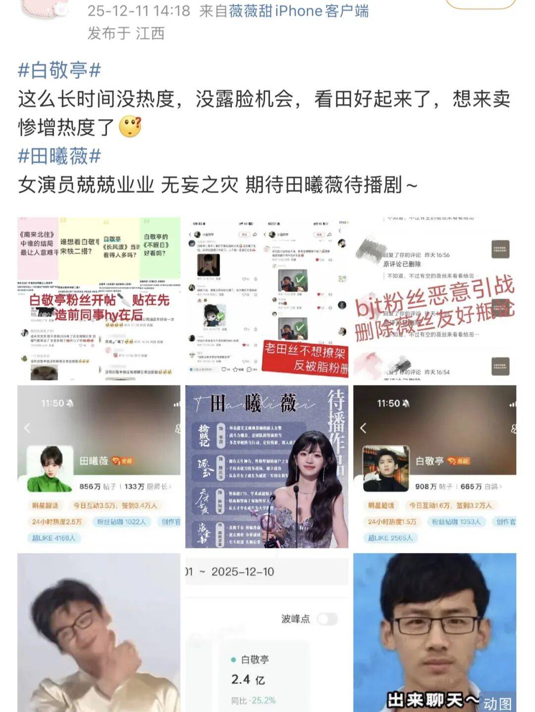 明明没有任何实质合作消息吧?不过是有网友发了个标题为“白敬亭田曦薇不能再合作吗”的帖子而已,两家粉丝就直接拉开架势互撕,把三年前《卿卿日常》的旧账翻得底朝天。