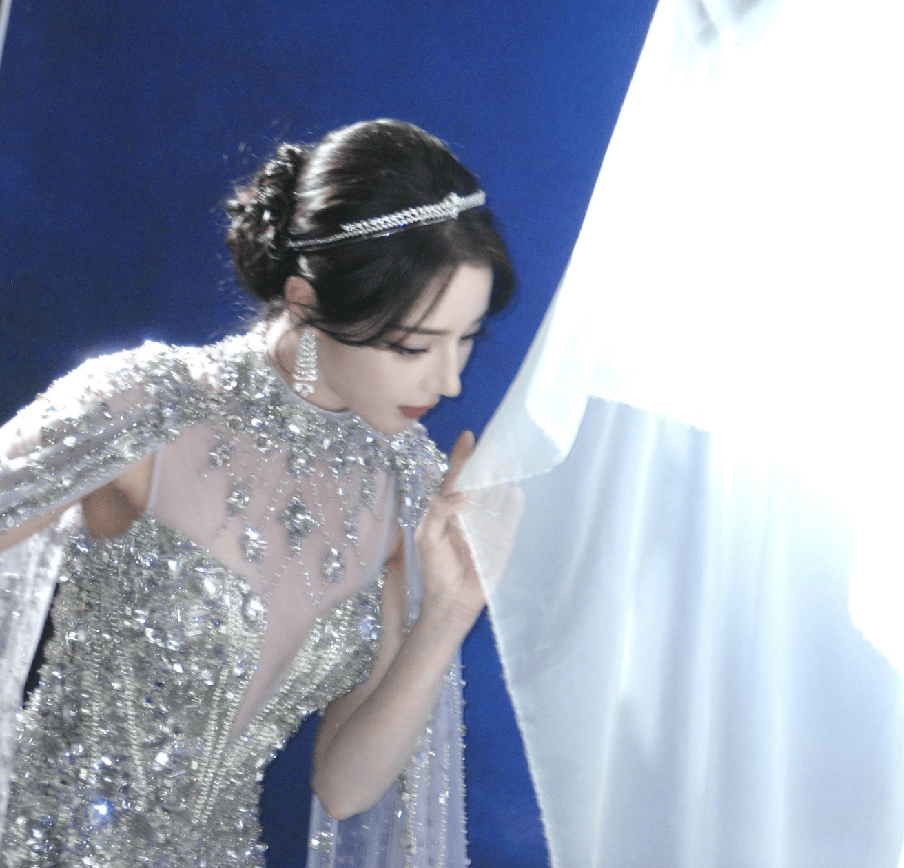 迪丽热巴轻靠在垂落的轻纱旁,银闪礼服的质感细腻高级。