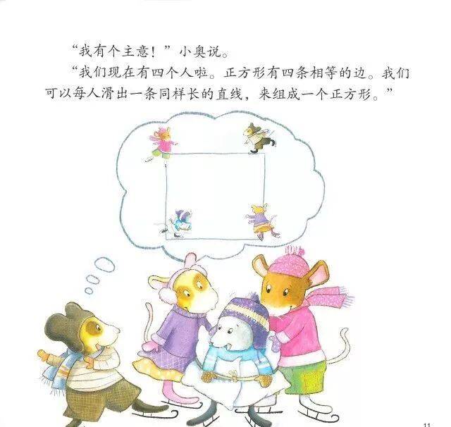 “我们现在有四个人啦。正方形有四条相等的边。我们可以每人滑出一条同样长的直线,来组成一个正方形。”