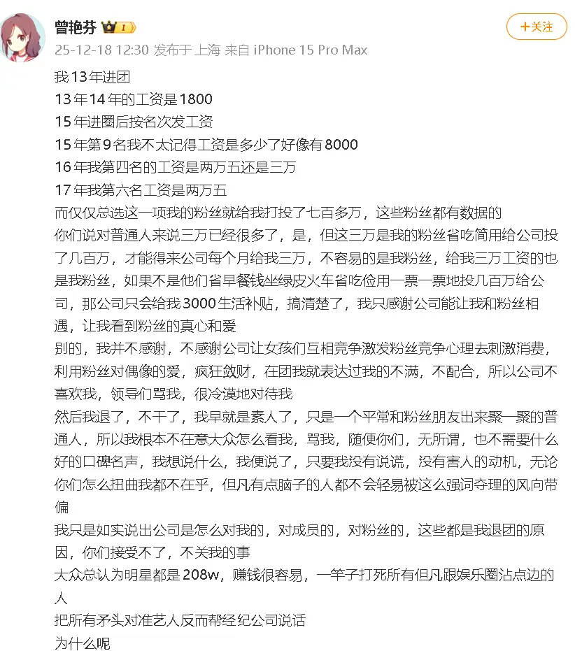 搜狐娱乐讯 18日,曾艳芬再发长文回应近日与丝芭争议,她透露自己拿第四名时工资是两万五或三万,但粉丝给她打投了七百多万:“不容易的是我粉丝,给我三万工资的也是我粉丝。”她表示不感谢其他,在团时期就表达过不满,所以被公司领导冷漠对待。她也回应此前发布的长文:“我没有说谎,没有害人的动机”,“我只是如实说出公司是怎么对我的,对成员的,对粉丝的,这些都是我退团的原因,你们接受不了,不关我的事。”