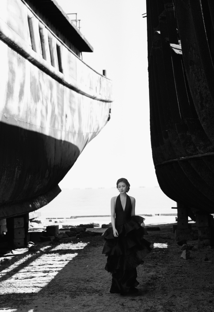 李兰迪姿态慵懒松弛,废弃船滩的粗粝背景裹满冷艳氛围,故事感十足。