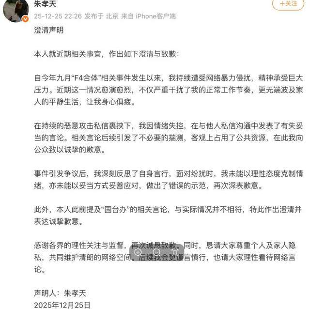 当晚,朱孝天的声明终于到来。文中,他将此前关于“国台办调查”及公司违规的言论定性为“与实际情况并不相符”,并将其归因于“自今年九月‘F4合体’相关事件以来持续遭受网络暴力”,在“恶意攻击私信裹挟下”“情绪失控”所致。他为此“占用公共资源”向公众致歉,并表示“深刻反思”。然而,这份声明全程未直接向被牵连的五月天成员阿信及“相信音乐”等具体当事人致歉,也未对其爆料的原始动机和所谓“调查”细节作出任何澄清。