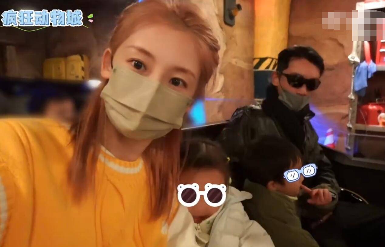 郑恺、苗苗与女儿、儿子一起玩“疯狂动物城”项目,一家四口同框合影好有爱。