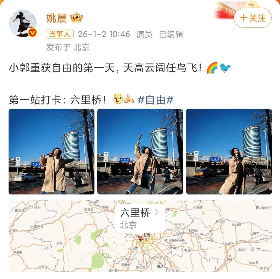 在网友们纷纷为郭芙蓉获得自由感慨时,姚晨也通过微博发文:“小郭重获自由的第一天,天高云阔任鸟飞!”