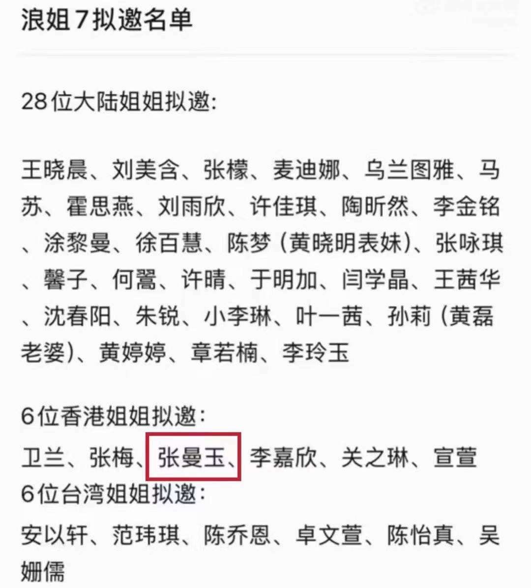 浪姐其实已经到了可有可无的程度,因为都是邀请一些已经没有名气的姐姐回锅包装再度出发,稍微有点热度,但热度真的不是很大,所以这个节目到了需要有人拯救的时候,而这个人可能是影后张曼玉,但是张曼玉出席的可能性不是很高,只能说有50%,因为她很爱唱歌,但她的烟嗓听起来很头大。