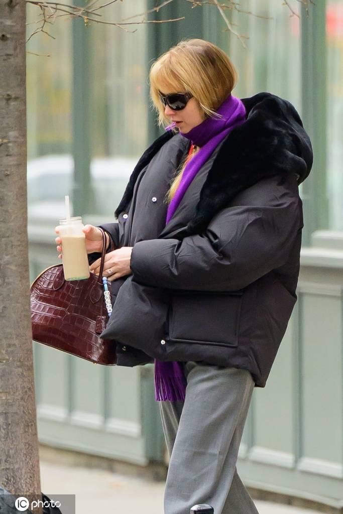 在外出时,她身着一件黑色羽绒服、戴了一条紫色围巾,搭配宽松的灰色阔腿裤和一双雪地靴,还戴了副太阳镜,拎着一个酒红色的手提包作为配饰。