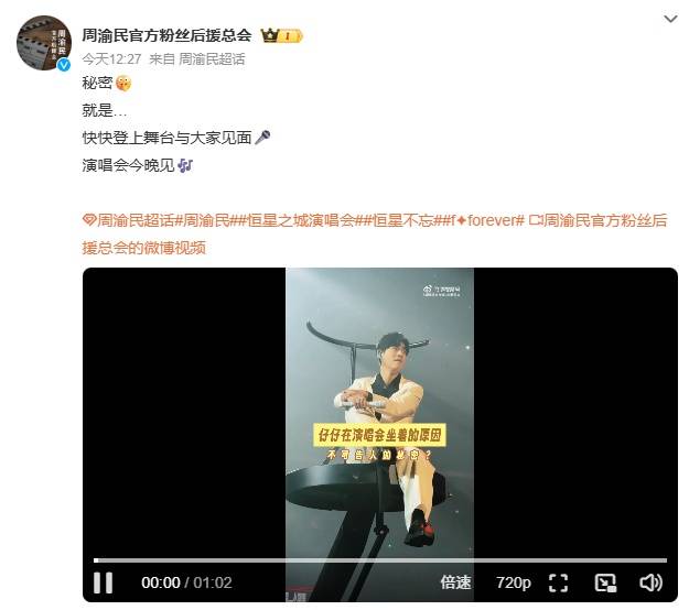 1月9日,周渝民官方粉丝后援总会发布视频,阿信现身评论区,调侃“大家的仔仔营业了”。视频中,周渝民回应了在“F✦FOREVER 恒星之城巡回演唱会-上海站”中,频频坐着或蹲着唱歌。