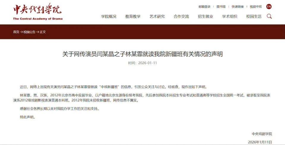 虽然不是第一时间道歉,但在中央戏剧学院出面证实闫学晶的儿子林某读的不是中戏新疆班,而是中央戏剧学院正常的表演系科班毕业之后,闫学晶的道歉紧随其后。