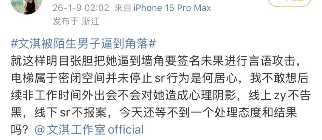 就在电梯口,一名体型壮硕的陌生男子突然冲出来,一路尾随不说,还直接上前,用身体将文淇强行逼到墙角,死死拦住去路,反复、强硬地索要签名和合影。