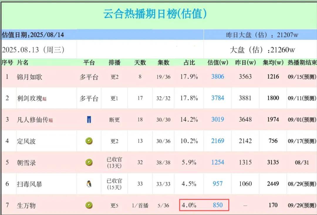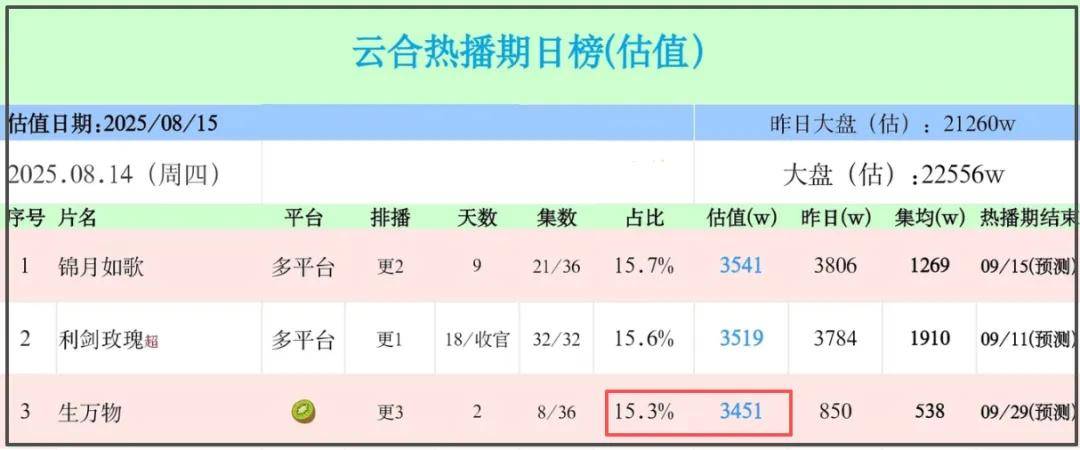 网播成绩方面,《生万物》开局也不理想,大盘播放量占比为4%,播放量估值850万。但是,上线次日,口碑发酵,大盘播放量占比猛增,达到了15.3%,播放量估值3451万,是前一天的四倍,低开高走。