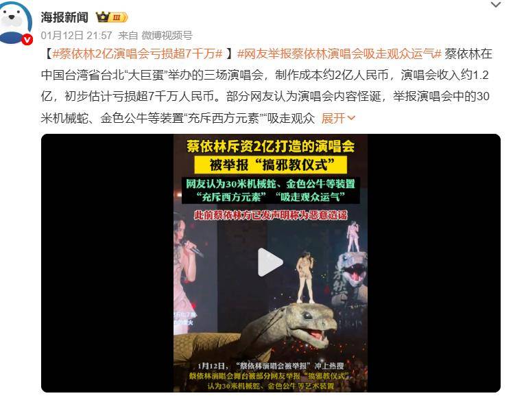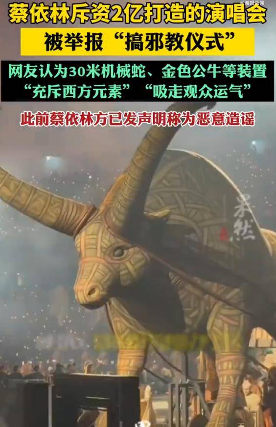 部分网友将矛头直指舞台意象,举报称机械蛇、公牛等“充斥不祥西方元素”,甚至荒诞指控其“吸走观众运气”,所以将演唱会举报,举报信达数百封提交至多地文旅局,要求叫停"不合时宜"的演出。