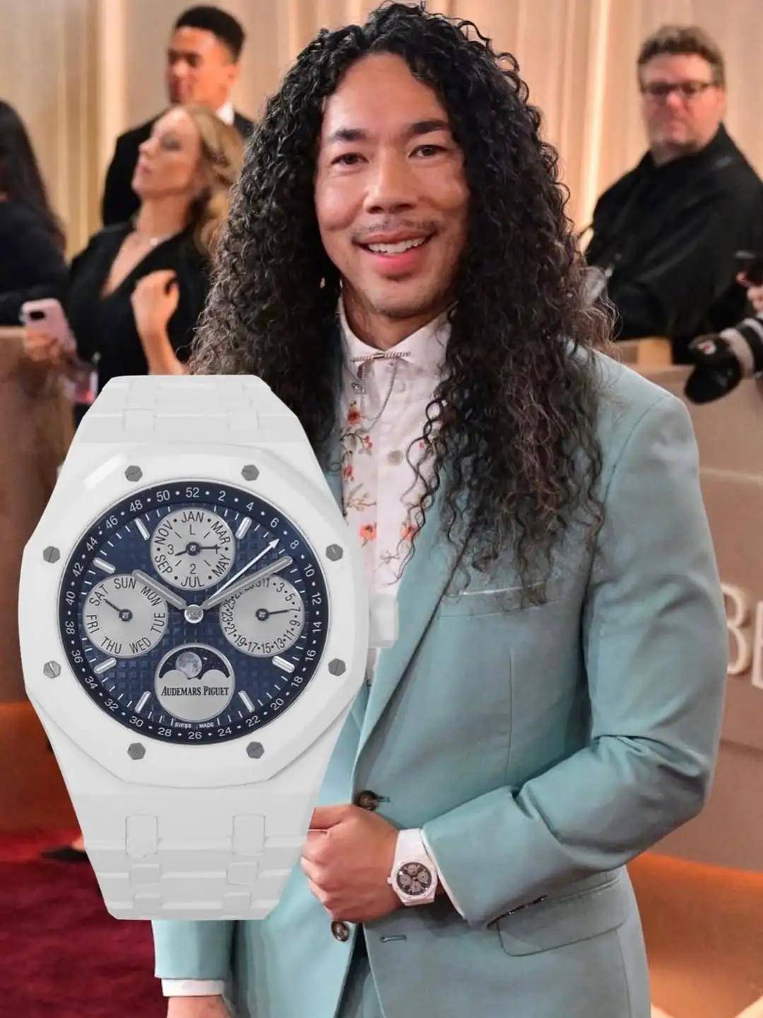 同戴AP的还有Tramell Tillman,他选了皇家橡树“Jumbo”超薄镂空腕表,18K白金加上镂空表盘,机械美感优雅又硬核。