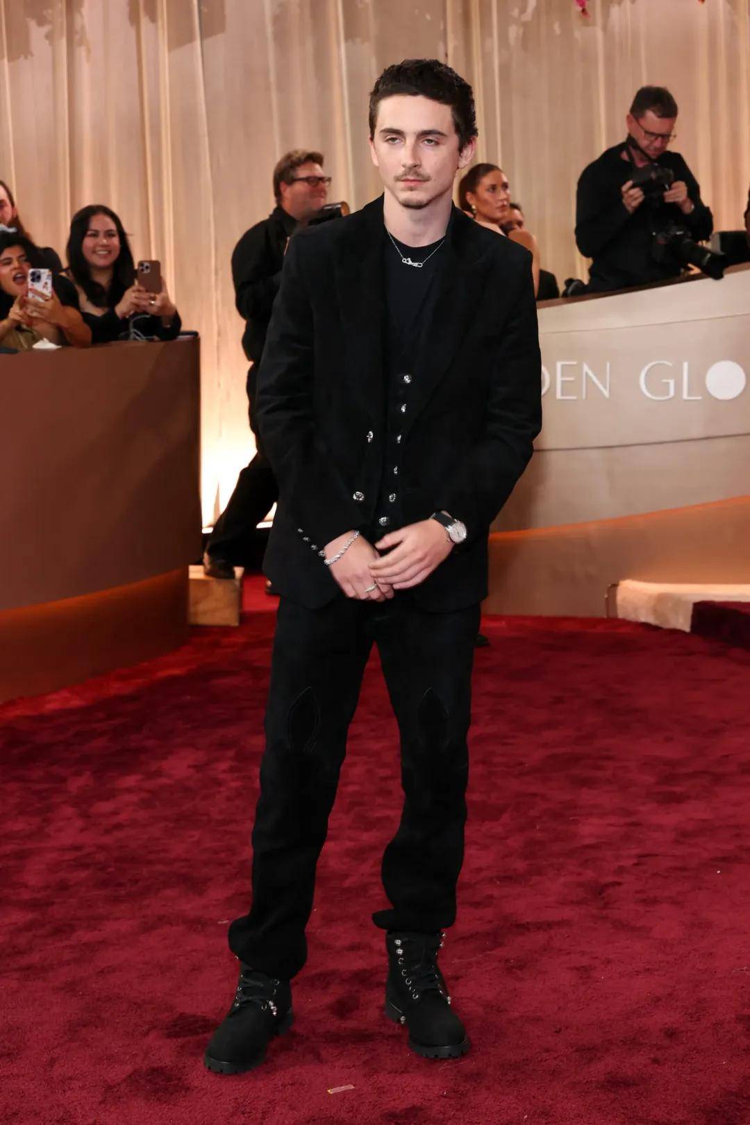 刚刚解锁金球奖最年轻影帝的甜茶,一身Chrome Hearts西装戴卡地亚猎豹,搭配Timberland联名靴,融合了高级时装和街头穿搭,表情也始终固定在耍酷模式。