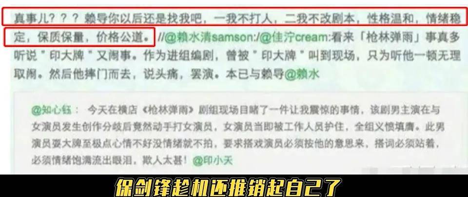 保剑锋当年一边手撕印小天,一边不忘推销自己要资源,事后翻车也坚决不认错,和他对待前妻黄慧颐的态度一模一样。